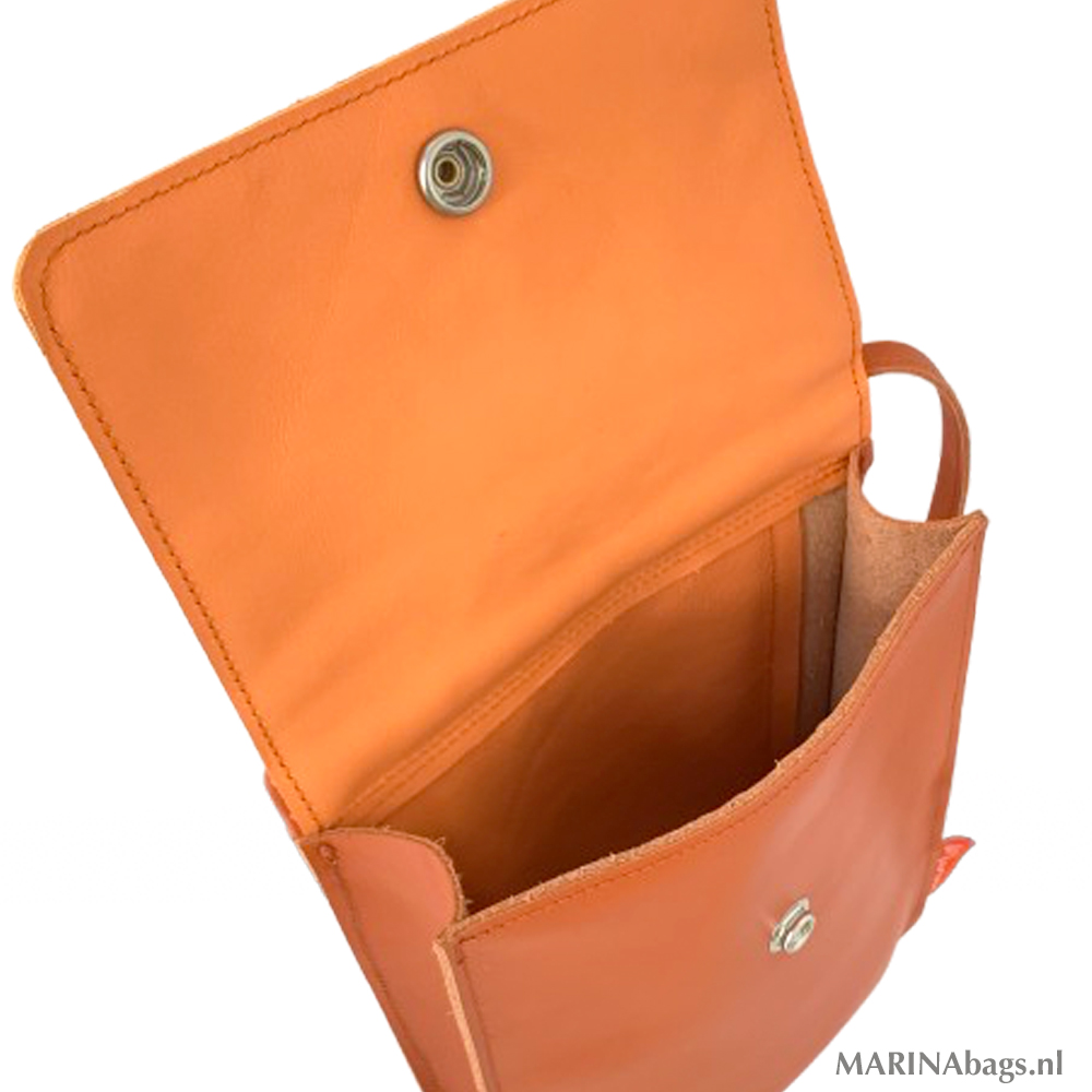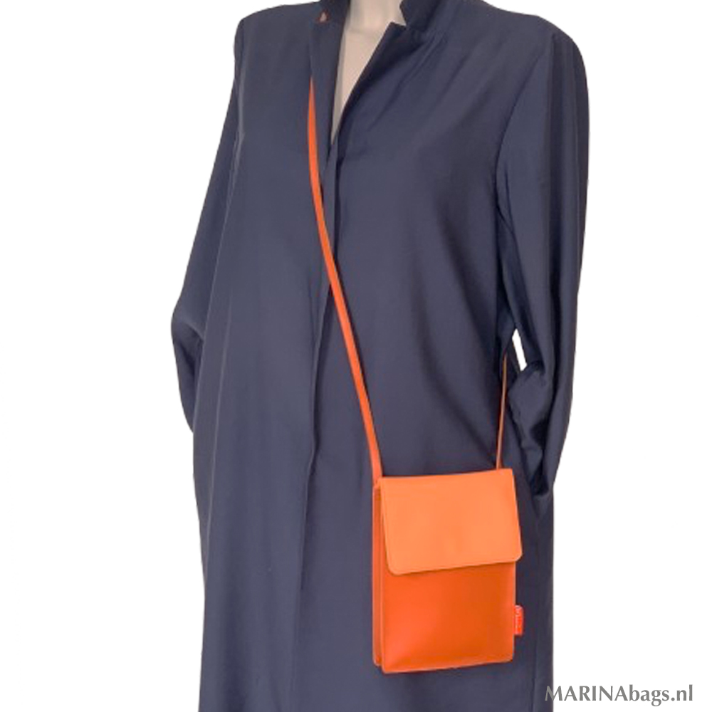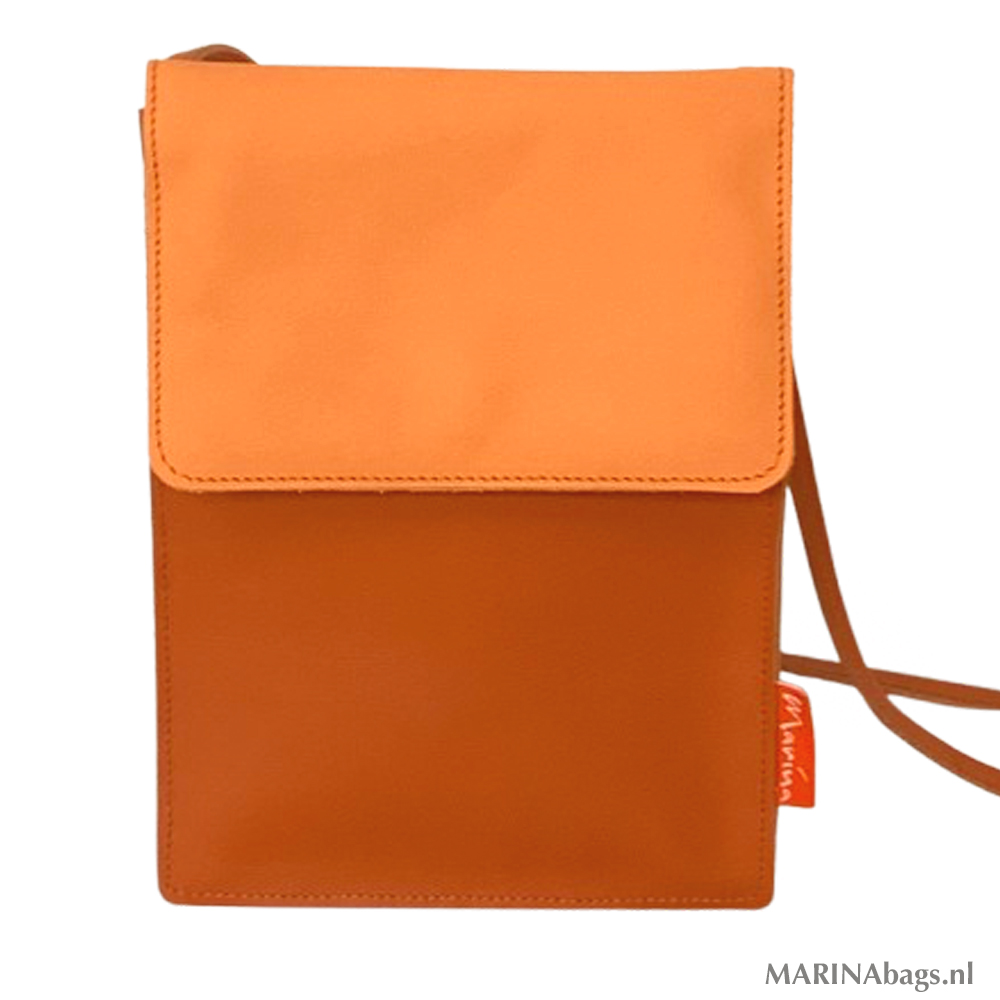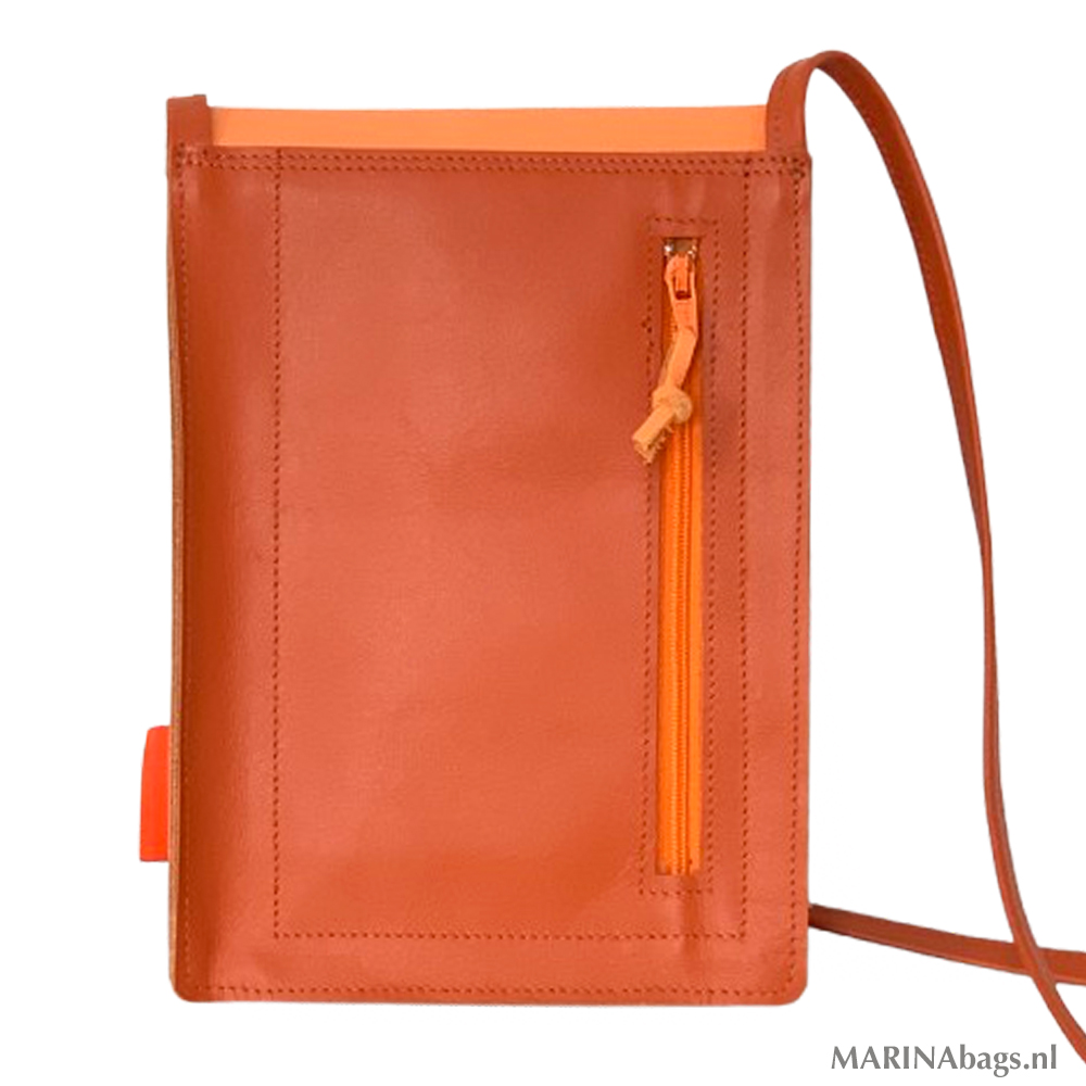 Een stijlvol en superfunctioneel tasje voor man en vrouw in twee tinten oranje leer.
