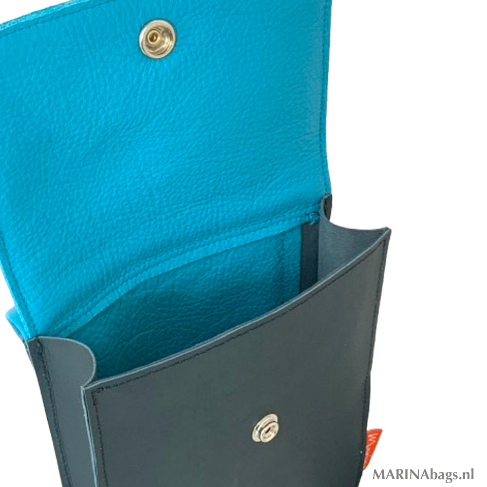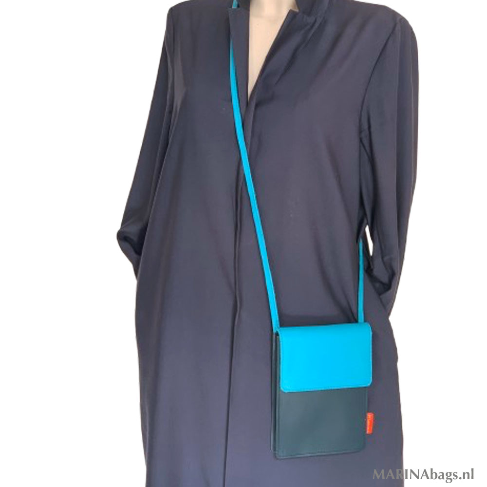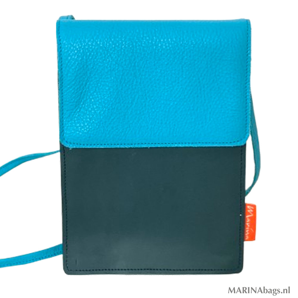 Een stijlvol en superfunctioneel tasje voor man en vrouw in turquoise en blauw leer.
