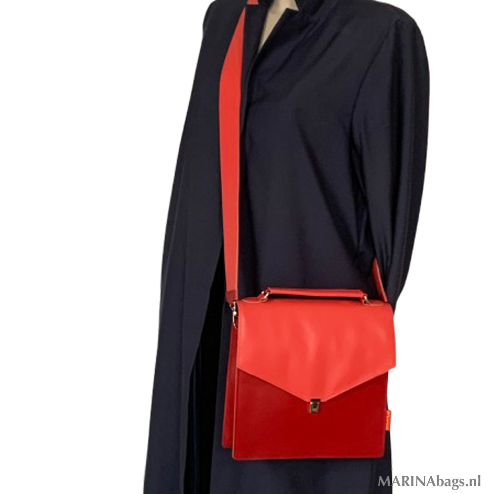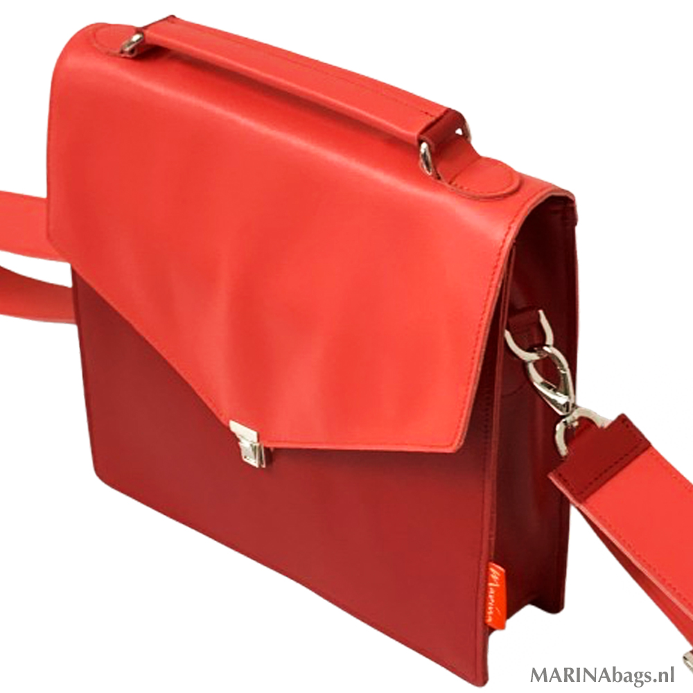 Een fijne, ruime schoudertas gemaakt van een mooie kwaliteit rood leer in twee tinten.