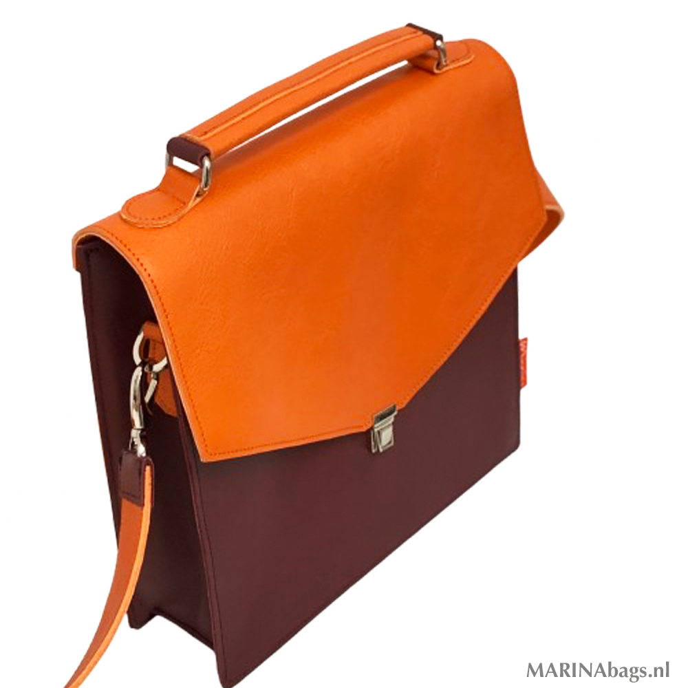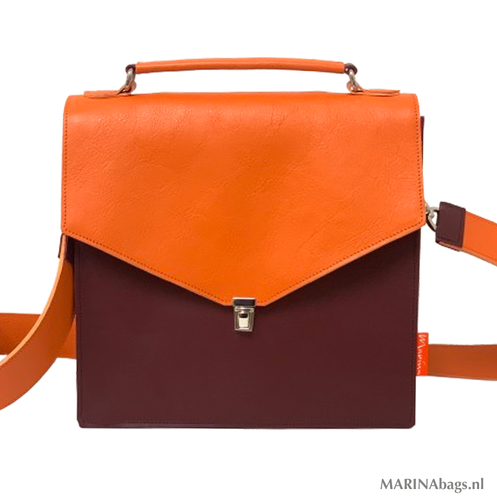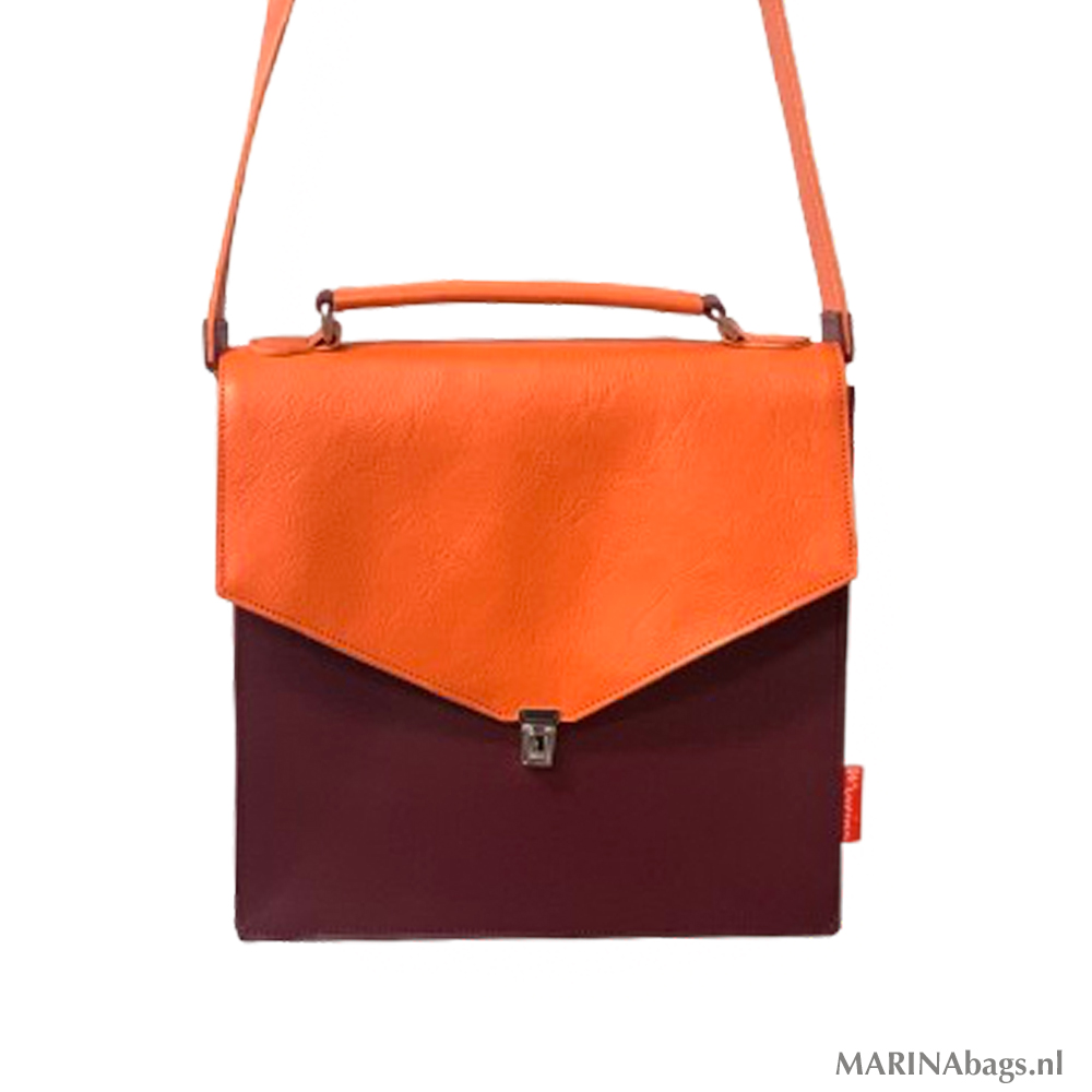 Een fijne, ruime schoudertas gemaakt van een mooie kwaliteit leer in oranje en bordeaux.